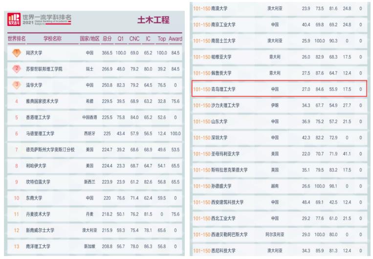 日前,软科公布了2021世界一流学科排名。在土木工程学科中,全球共有300所高校上榜,其中,中国共有67所大学(内地60所)。同济大学、清华大学、东南大学等20所内地大学位列土木工程学科前100名;青岛理工大学、长安大学等11所大学位列全球土木工程学科101-150名,其中,青岛理工大学土木工程学科稳居山东省属高校首位。
