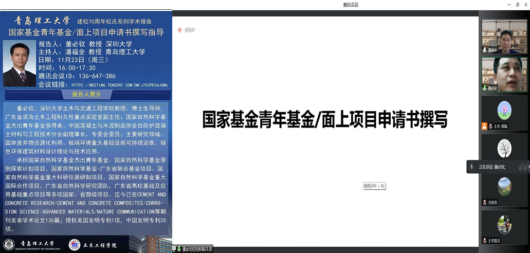 学院同时邀请了国家自然科学基金杰出青年科学基金获得者深圳大学董必钦教授作国家基金申请书撰写指导线上讲座,全院100余名教师积极参会。董必钦教授从国家基金的创新构思角度,深入阐述了项目撰写中创新立意,创新方案与创新逻辑。董必钦教授强调,国家自然科学基金的申报是科研工作者科研道路上的长期任务,鼓励学院老师勇担科研使命,潜心科研积累。报告结束后,董必钦教授和参会教师们进行了亲切交流,详细解答了他们提出的基金申报中的问题和困惑。