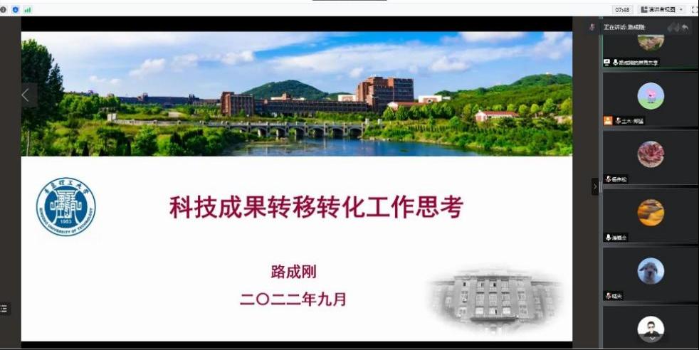 一、打通科技成果转化“堵点”,推动成果产业化。为畅通学院知识产权转化渠道,让科研成果走向市场变得更加通畅,学院邀请科技处路成刚副处长做科技成果转移转化线上专题培训,学院师生集体学习。路成刚详细解读了科技成果转化政策,介绍了科技成果转化政策制定的背景、科技成果的概念、转化的方式、技术合同形式和成果转化收益分配等内容。路成刚强调,科技成果转化是科研创新发展的重要内容,是服务国家战略和地方经济社会发展的重要环节,每一位科研人员应充分重视。